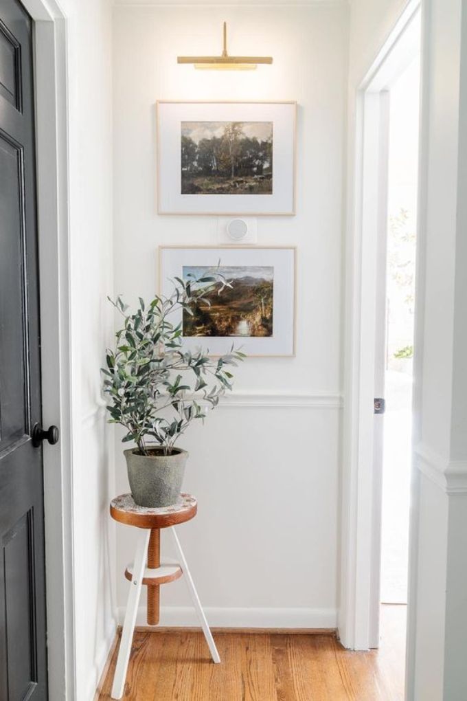 Nếu như bạn là người yêu tranh, hãy biến không gian hành lang trở nên độc đáo và ấn tượng hơn. Bạn hãy tự chọn cho mình những bức tranh mà bạn yêu thích, có thể chọn nhiều kích thước khác nhau và gắn lên tường theo bố cục tự do. Nếu bạn muốn sáng tạo hơn, bạn có thể sếp tranh thành hình trái tim, vòng tròn để thu hút ánh nhìn người khác.