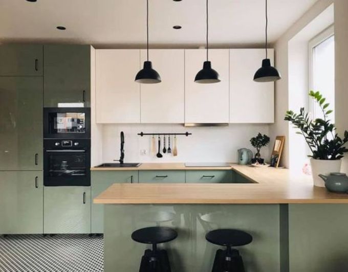 Với phong cách hiện đại, phòng bếp được thiết kế bao gồm: bếp chữ U và tủ bếp với hai màu trắng đen tối giản, kết hợp cùng nhiều trang thiết bị tiên tiến có tính ứng dụng cao. Trang trí nhà bếp với phong cách này thích hợp cho các gia đình trẻ với lối sống hiện đại, thực tế.
