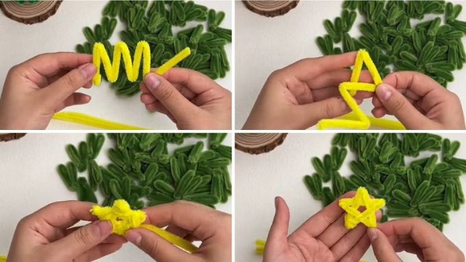 Gấp đoạn kẽm nhung màu vàng theo đường dích dắc bằng nhau. Uốn cọng kẽm thành hình ngôi sao 5 cánh. Đoạn kẽm dư còn lại bạn hãy quấn vào 5 cạnh của ngôi sao nhé!