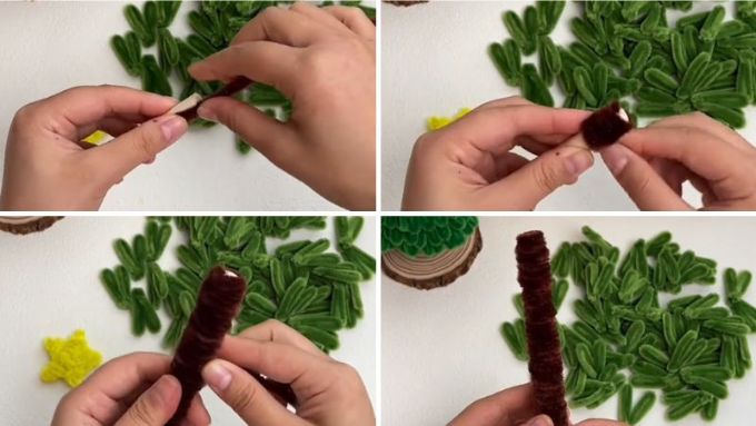 Dùng ống hút giấy đã chuẩn bị, đính keo nến lên đầu, dán đầu sợi kẽm nhung màu nâu lên chỗ keo dán cố định. Quấn kẽm nhung quanh thân ống hút để tạo thành thân cây thông.