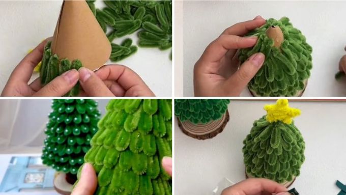 Sau khi dán lá cây thông xong, bạn chỉ cần điểm thêm một vài món đồ trang trí cho cây thông như: ngôi sao, nơ, dây kim tuyến, đèn trang trí,.. Vậy là đã hoàn thành xong cây thông kẽm nhung để trang trí cho góc làm việc nhân dịp noel rồi đấy