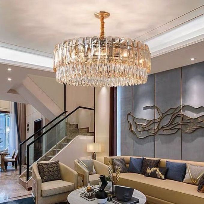 - Chất liệu đèn phòng khách làm từ pha lê, thuỷ tinh.