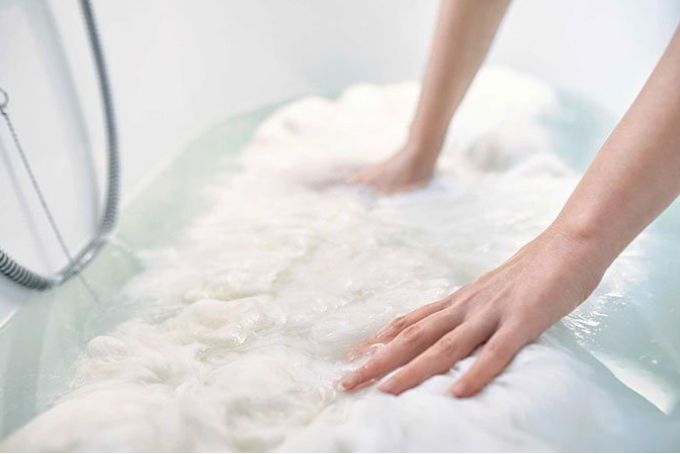 Thêm một chút chất tẩy lông cừu và len chuyên dụng, tuyệt đối không sử dụng xà phòng hay chất tẩy rửa có kiềm, hay enzym sinh học không dành cho lông cừu.