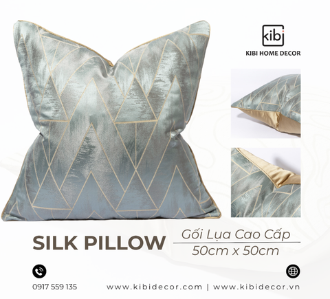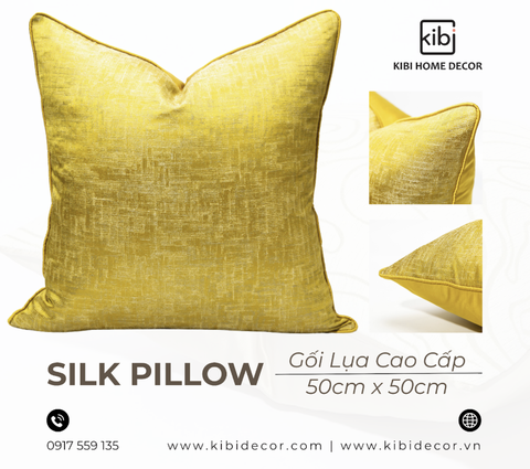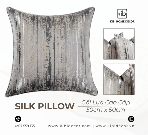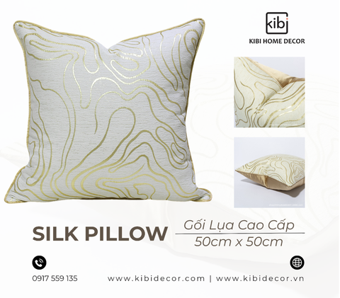 -Vẻ Đẹp Thanh Lịch Của Chất Liệu Cao Cấp: KiBi đặc biệt chú trọng vào việc tuyển chọn những mẫu gối được làm từ lụa cao cấp. Chất liệu này không chỉ mang lại cảm giác mềm mại, mát tay mà còn có độ bóng nhẹ tự nhiên, tạo nên sự sang trọng tinh tế. Lụa có khả năng bắt sáng tốt, giúp chiếc gối trở thành một điểm nhấn lôi cuốn, phản chiếu ánh sáng dịu dàng, làm cho không gian trở nên ấm áp và đẳng cấp hơn.