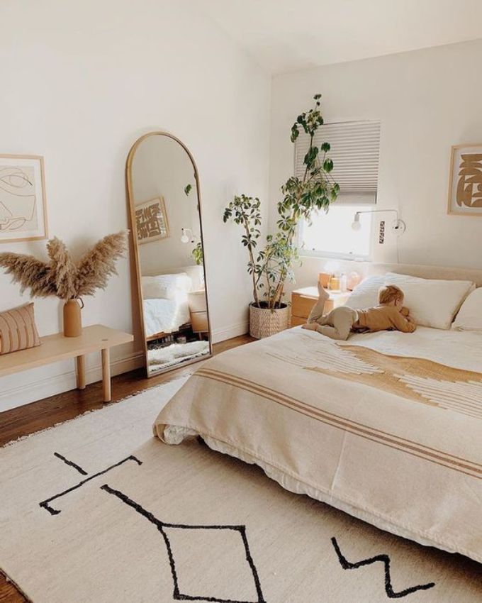 Đối với phòng ngủ có diện tích nhỏ, bạn nên chọn dạng thảm chữ nhật, thảm tròn trải ở vị trí cạnh giường để tạo sự thoải mái, ấm áp cho căn phòng. Với những phòng ngủ rộng rãi hơn, bạn nên dùng thảm tròn hoặc thảm hình oval trải ở giữa phòng để tạo điểm nhấn.