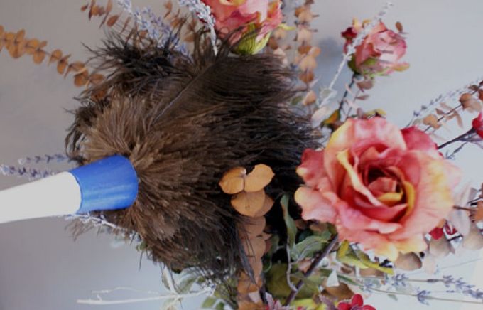 Để tránh ảnh hưởng đến hình dáng và độ bền màu của hoa lụa, bạn nên thực hiện theo các bước sau: tay cầm cố định bông hoa, sử dụng chổi lông hoặc khăn mềm để quét sạch bụi bẩn bám trên những bông hoa. Cách này giúp bụi bẩn rơi ra sàn nhà và không rơi sâu vào bên trong bông hoa.