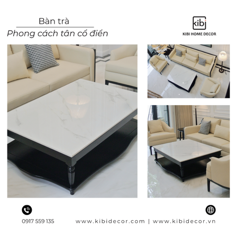 Đi cùng sofa là bàn trà tân cổ điển với tay bo và mặt bàn sang trọng. Không phô diễn, nhưng gọn gàng, chuẩn tỷ lệ, và đủ để tạo thành một bố cục tiếp khách vừa sang vừa dễ dùng hằng ngày.