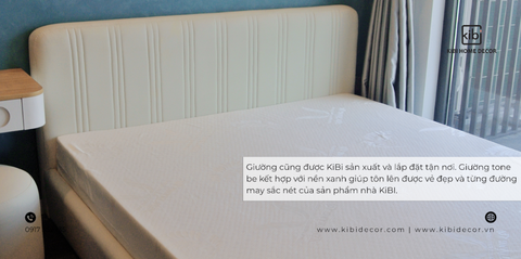 Phòng ngủ chính thì ấm áp và trau chuốt hơn. Từ giường form vững chắc, bọc vải mịn đến tab đầu giường, bàn trang điểm và đôn – Tất cả đều được KiBi lựa theo gam màu nhã nhặn, hợp với ánh sáng phòng. Điểm nổi bật chính là sự mượt mà ở từng đường bo, từng nếp may, tạo cảm giác nghỉ ngơi hoàn chỉnh.