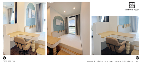Phòng ngủ nhỏ của con là nơi KiBi đặt nhiều tâm sức nhất. Phần mộc hoàn thiện mịn, bo tròn toàn bộ góc cạnh để bé an toàn khi sử dụng. Giường, bàn học, ghế làm việc đều được đo đạc kỹ để vừa vặn không gian nhỏ. Nhờ vậy, căn phòng trở nên đáng yêu, thoáng và rất đúng tinh thần của trẻ nhỏ—nhẹ, sạch và an toàn.