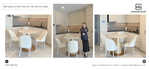 Đến phòng bếp, KiBi chọn bộ bàn ghế ăn tròn mang cảm giác sum vầy. Thiết kế chắc, dáng ghế ôm lưng, tổng thể sáng và ấm, giúp bữa tối gia đình trở nên gần gũi và vui hơn.