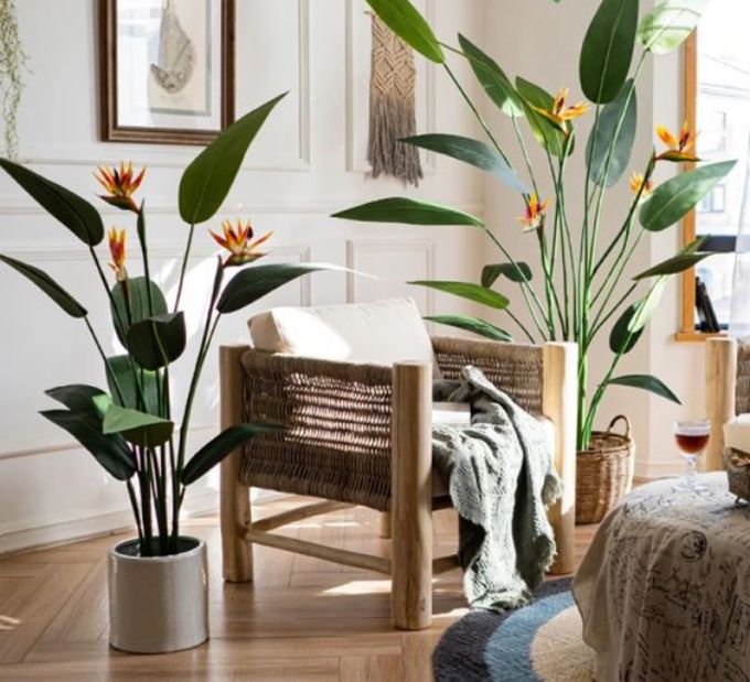 Là loại cây nhân tạo được làm từ chất liệu nhựa PVC hoặc Silicone, cây thiên điểu giả được tái tạo hình giống như một cây thiên điểu thật. Đây là loại cây được sử dụng khá phổ biến trong trang trí không gian sân vườn, công viên, khuôn viên toà nhà, trung tâm thương mại, khách sạn, quán cà phê,...