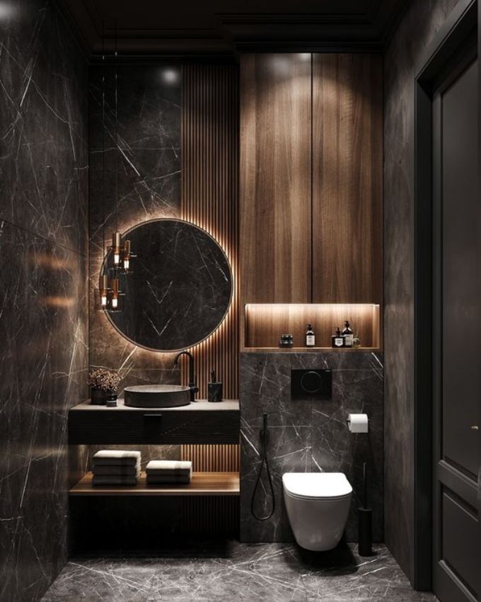 3. Tạo không gian nhà tắm sang trọng bằng gam màu tối